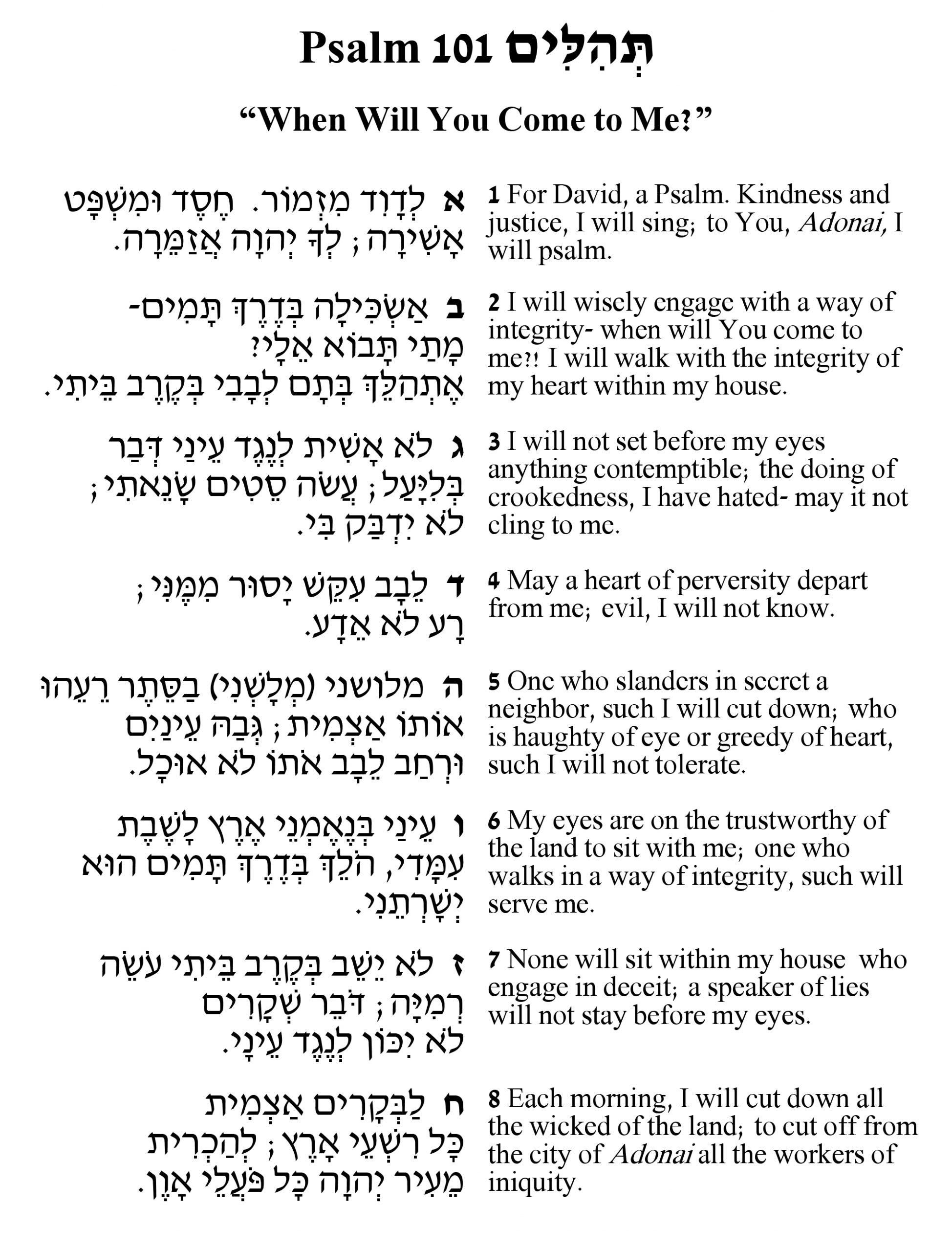 Lincoln Center commissioned, David Lang (my wife Linda’s cousin) to compose music for Psalm 101 for a 2017 festival on the music of the Psalms. David entitled his four-minute composition, “If I Sing.” I love David’s take on the Psalm: negotiation with God. I am reminded of the words of Shalom Noah Berzovsky (the Jerusalem-based, 20th century, Slonimer Rebbe), “Songs to God not only express joy; they express pain as well. There is no greater prayer than pouring out one’s heart over the distance one feels from God.”