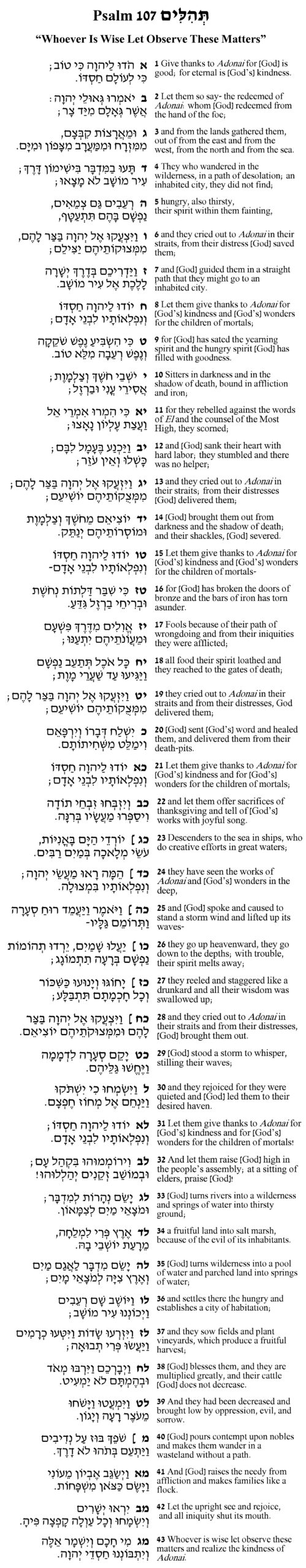 Psalm 107 begins the fifth book of Psalms. Ahead are verses regularly sung in our communal prayer: Hallel (113-117); Psalms of Ascent (120-134) and Ashrei-plus (145-150). Psalm 107 repeatedly uses language also found in Isaiah, the prophet who preached in the 6th century before the Common Era at a time of Babylonian exile and the promise of return. There are also echoes of Job. And yet, Psalm 107’s stirring images and weave are distinctly its own. The nautical description in the Psalm is included in Herman Melville’s Moby-Dick and was often recited at the start of a sea voyage. In Israel today, this Psalm is the first reading for the liturgy of Israeli Independence Day.