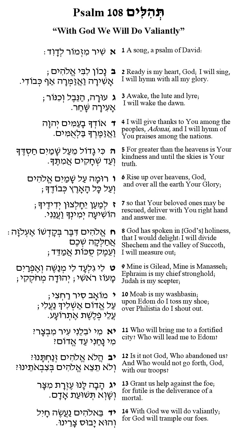 Creativity is putting two items together in a novel way, producing a surprising result. This is true for cooking and for our Psalmist. Psalm 108 juxtaposes Psalm 57 (verses 8-12) with Psalm 60 (verses 7-14). These two Psalms are distinctive: Psalm 57 is a highly individualistic plea and Psalm 60 is nationalistic, with a tone of bitterness for a recent defeat. And yet, Psalm 108 brings these two components together to describe awaking early to act valiantly to fulfill a promise of God, victory over a foe. The familiar words offer resonance for confidence to meet a new challenge.