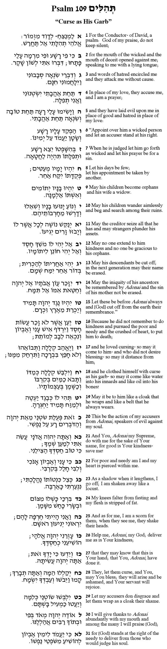 Some examples of curses from Psalm 109: “May his children wander aimlessly and beg and scavenge amidst ruins; may the creditor seize all that he has and may strangers plunder his assets; may no one extend to him kindness and no one be gracious to his orphans” (verses 10-12). Jewish commentators are bothered by the focus not just on the foe, but on his children. Some say that the words are just repeating the curses of the foe back at him, for which the Psalm also has evidence.