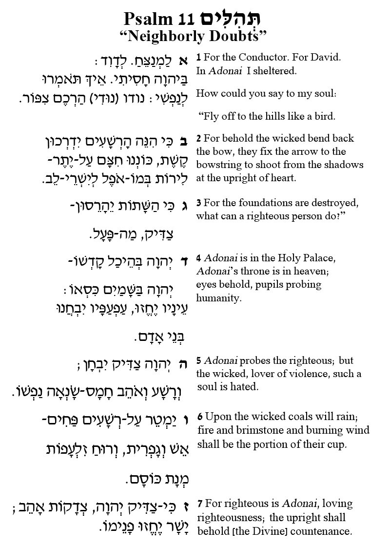 Psalm 11 is only seven verses. Neighbors challenge the Psalter as to the prosperity of the wicked, warranting a need to flee: “For the foundations are destroyed, what can a righteous person do?” The foundations can refer to society at large crumbling or provide a direct challenge to God for allowing the undermining of societal justice. The reference of God’s “raining fire and brimstone” is an echo of Sodom and Gomorrah of Genesis 19:24, when God eradicated evil. The Psalter is provoked in a time of trouble to respond with assurance that God sees and will eventually punish.