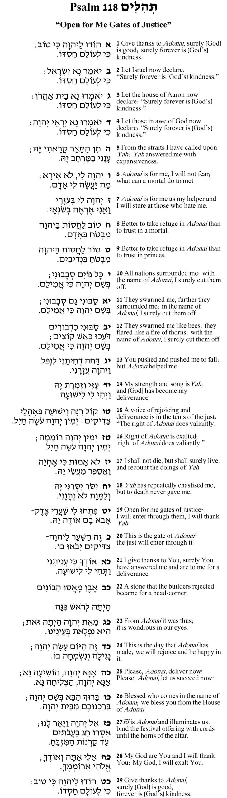 This is the longest of the six Hallel Psalms, as if there is so much to say and so little time. The Psalms moves back and forth: between words of celebratory praise and pleas for redemption; from the past to the present to the future; from the poem of the individual to inviting others to sing in a call and refrain; from speaking outside the Temple to moving through its gates. Those are the “gates of the just” and the gate is restricted, “the just will enter through it.” This is a Psalm marked by movement toward goodness. As if to say, the Hallel leads us from prayer toward righteous action.