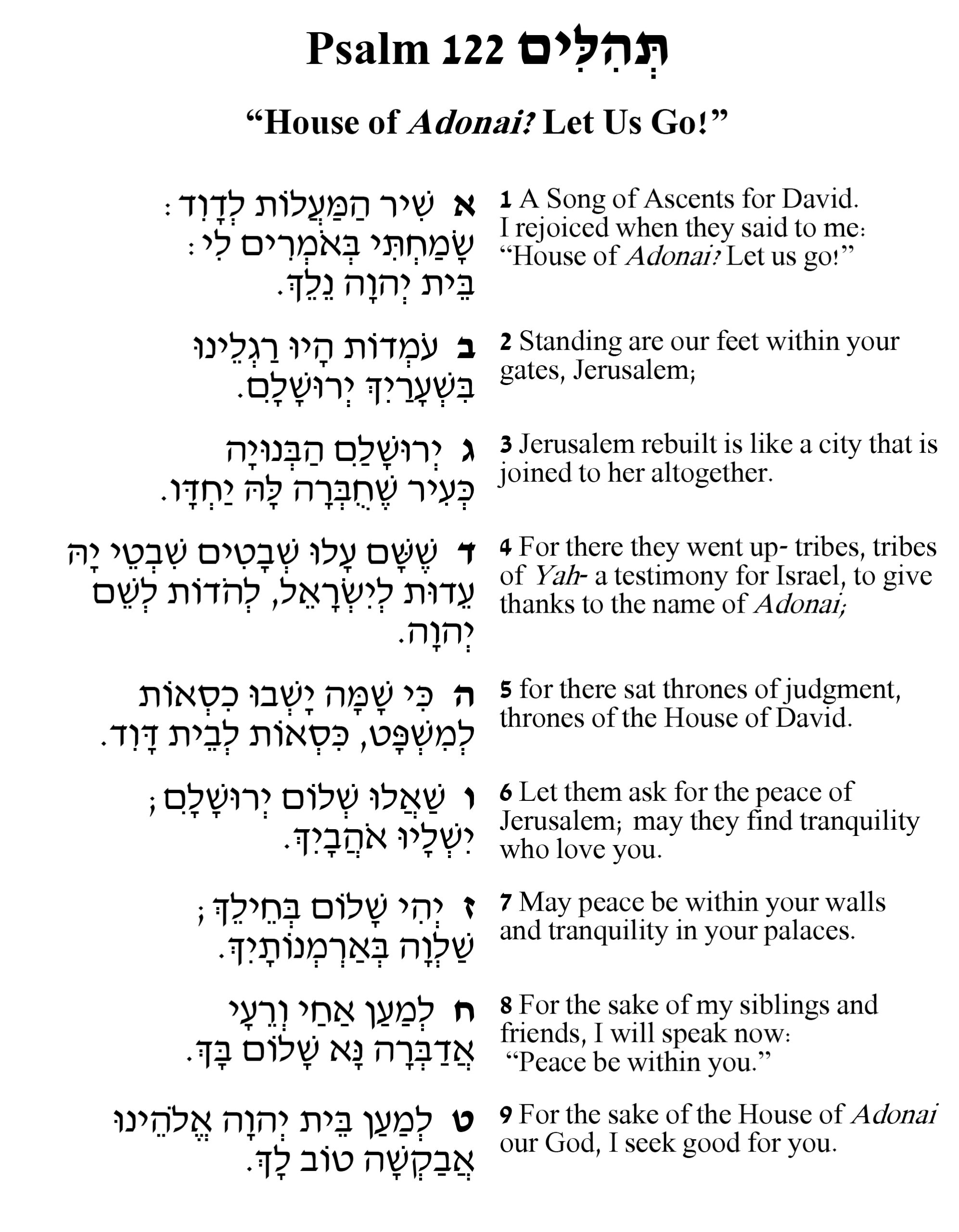 Psalm 122 is a pilgrimage poem, “House of Adonai, let us go. Standing are our feet within your gates.” Once present in Jerusalem, the Psalmist addresses Jerusalem directly as if a living being. Prayer is evoked for the peace and tranquility of the city and its residents.