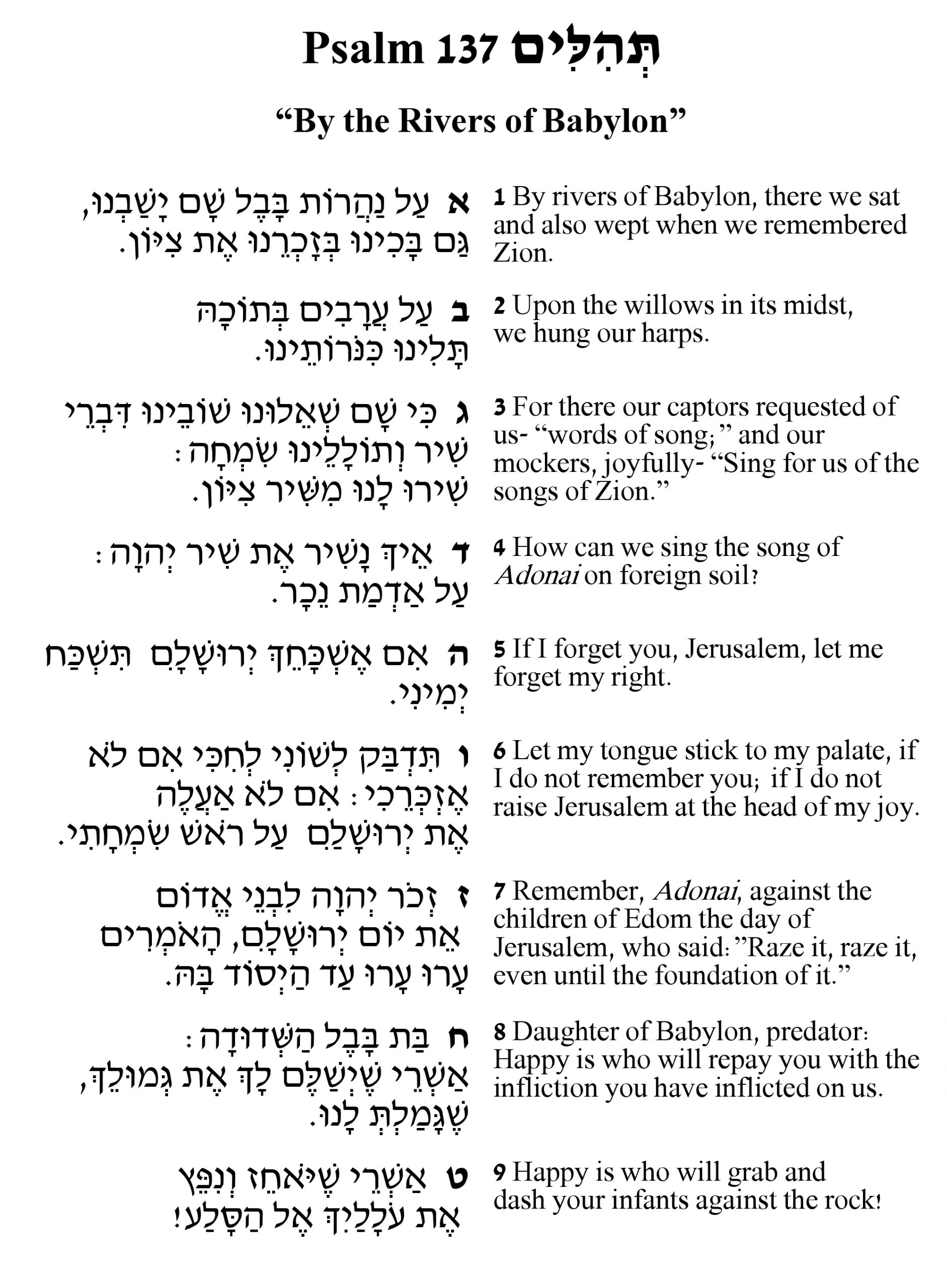 Ironically abounding in musical variations is Psalm 137, as the Psalm deals with the inability to sing. Opening with the woeful mourn of a Judean exile in Babylonia, the Psalm ends with a call for violent vengeance. The last three verses of the Psalm are often omitted from the songs and even from liturgy. In discussing my Psalm project, Rabbi Feinstein pointed to the last line of the Psalm as an example of the brutal honesty of Psalms.