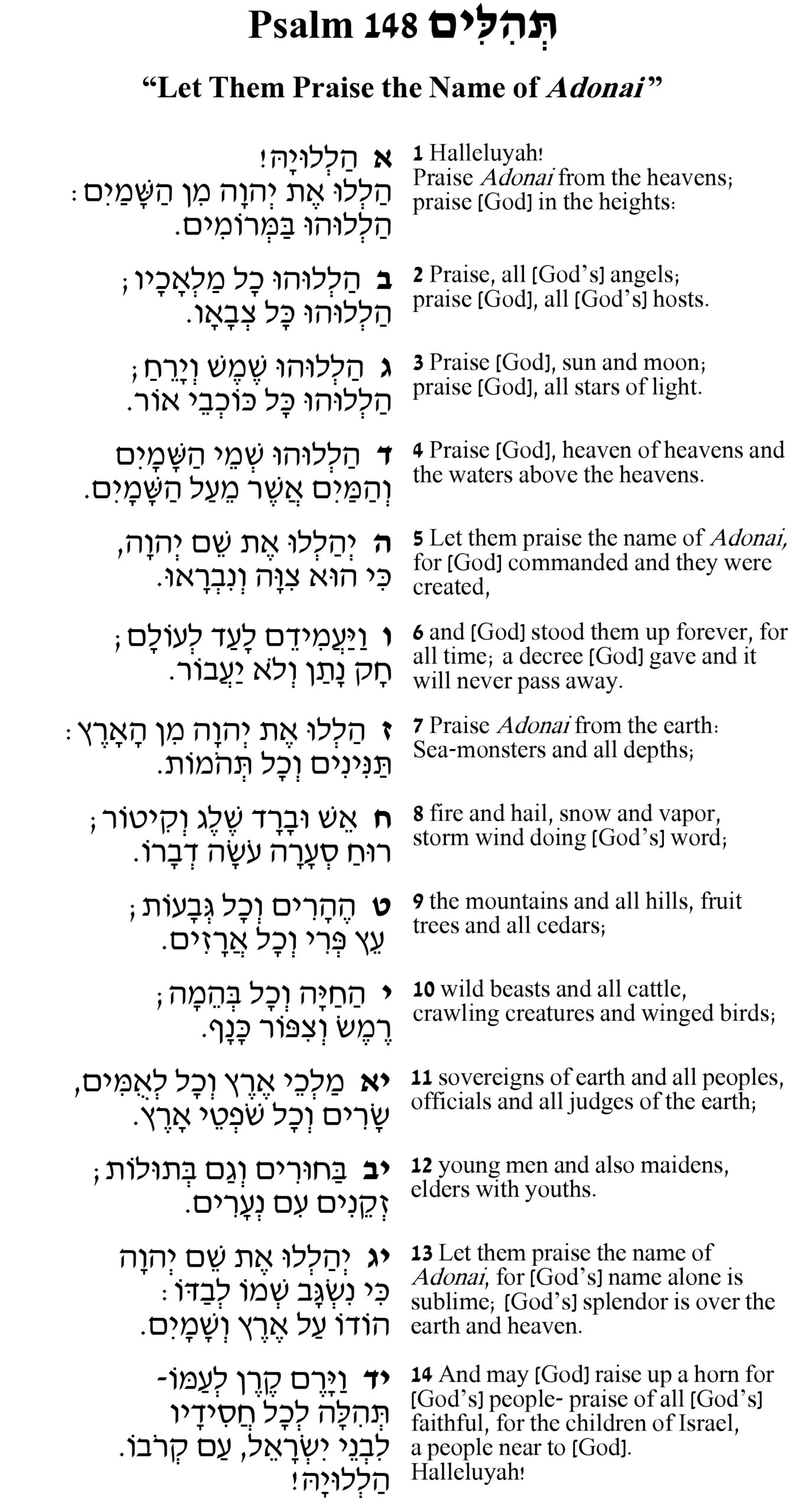 A symphony of praise brings Psalms to a crescendo. In Psalm 148, praise will emerge from the highest heavens and the brightest stars to the lowest depths of the sea and its sea-monsters; from fire and hail and fruit trees and cedars, young men and maidens to elders and youths. All sing praises to the Source of Creation.