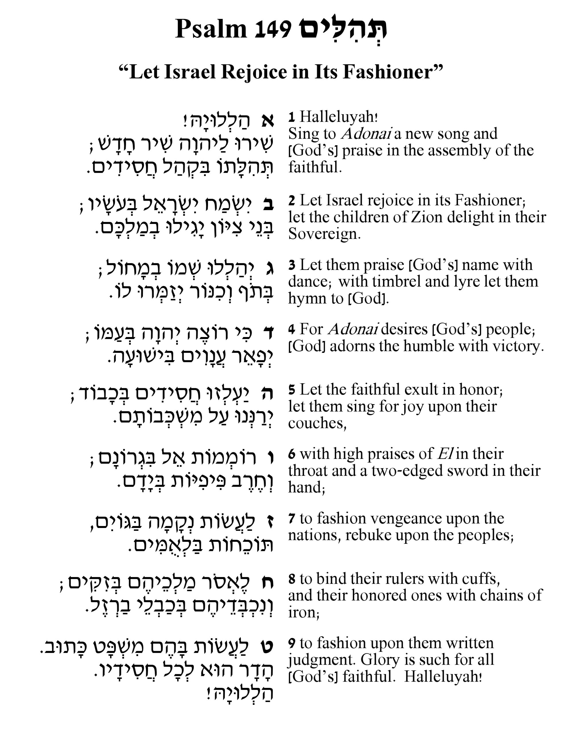 Peace is the yearning that repeats in our prayers and is presented at the end of Psalms. Glory of military victory is the promise or prompt in this penultimate Psalm. The first half describes celebration with singing and dance. We are not sure if it is a dance to prepare for war or a celebration of achievement. Likewise, we are unsure in the second half if God is the Warrior or provides the warriors with the ability to wield their “two-edged swords.” Such is the nature of fine poetry, two possible readings that are simultaneously inviting. What is clear is the trajectory of Psalms guides us to the hope of a time of justice actualized, enabling enduring security and peace.