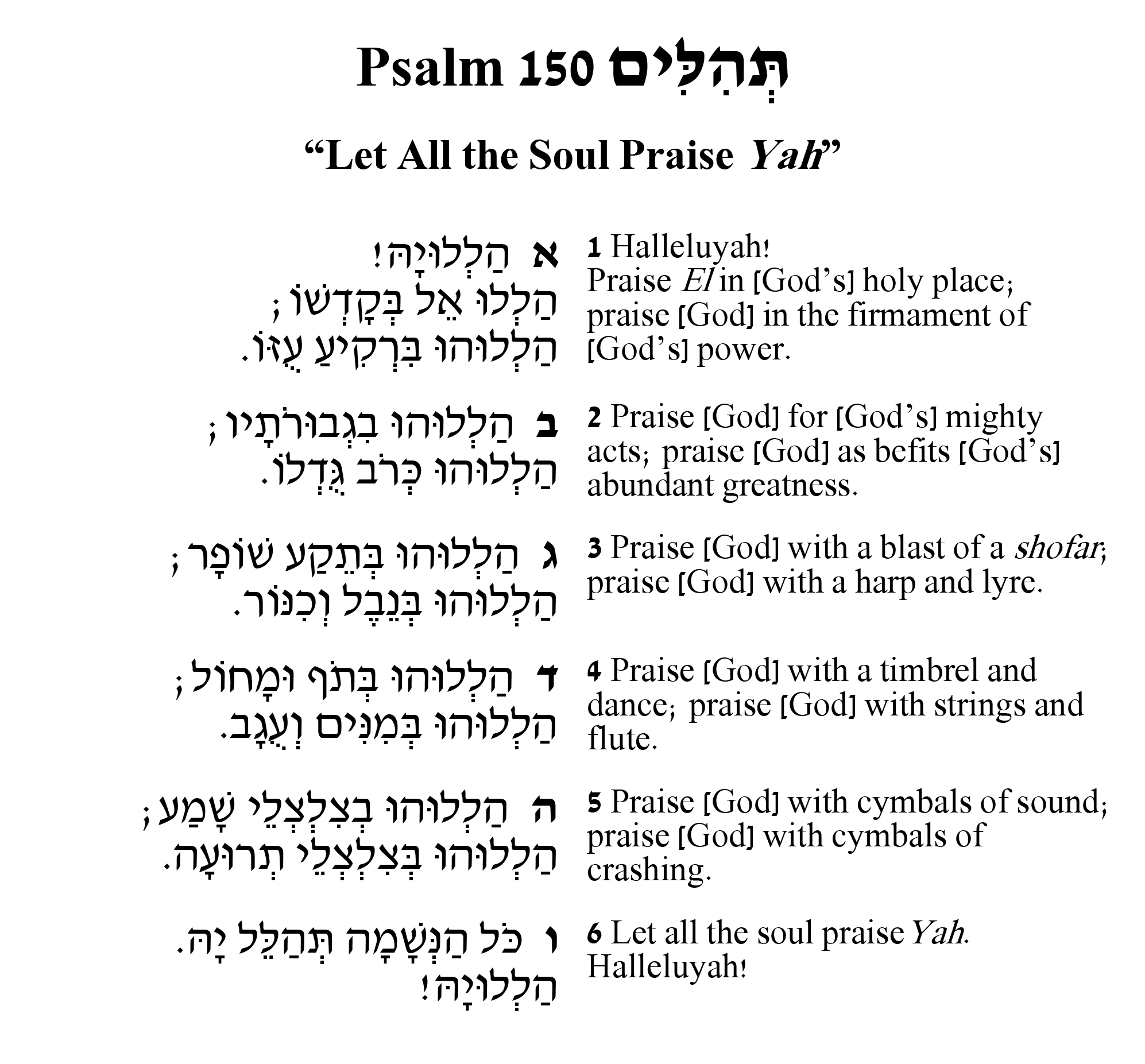 “The Musician’s Psalm” is a name for Psalm 150 due to the nine instruments presented as the orchestra of Divine praise. In the final verse, the 2,527th of the whole of Psalms, two words point to the tenth instrument, us. “Kol ha’nishama” has multiple possible meanings- let all souls; let all the soul; let each breath- “praise Yah.” This exuberant culmination is a call for us to praise the Source of creation.