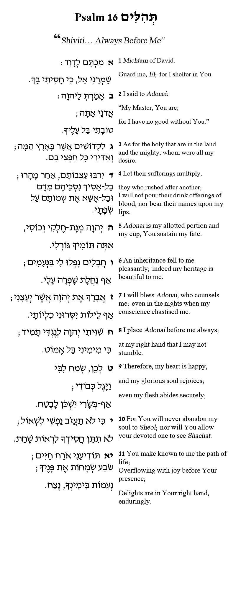 Shiviti is a Jewish mandala, an artistic image to spiritually concentrate the mind. In many traditional synagogues a shiviti is placed before the prayer leader. They are also hung in homes as folklore protection. The word and the phrase comes from Psalm 16. In context, the Psalmist rejects those who go after false gods and speaks of trust in YHVH. The Talmud (Sanhedrin 22a) in the name of Rabbi Shimon the Pious teaches, “A person who prays should regard himself (or herself) as though the Shechinah (God’s accessible, feminine dimension) were before him (or her)” and then quotes Psalm 16:8, “ I have placed (Shiviti) Adonai before me always… .