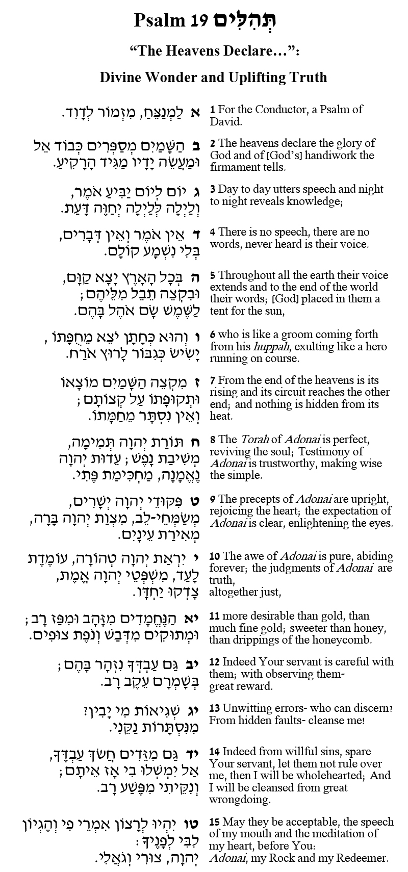 Come hear the musicality of Psalm 19. Consider https://www.youtube.com/watch?v=y-M_IBtaN50 to witness the exuberance of Psalm 19:8 as a hypnotic, religious song. The opening verses of the Psalm were put into classical music by Bach , Haydn, and Beethoven. This Psalm presents the the sun and stars as producing an inaudible symphony, and describes rejoicing over the sun’s rising each morning as a groom emerging from the huppah, the wedding canopy. The punchline of the Psalm’s focus on Creation and Revelation is Redemption: the tarnished soul of the Psalmist is worthy of cleansing forgiveness. We shall examine the fifteen verse psalm together.