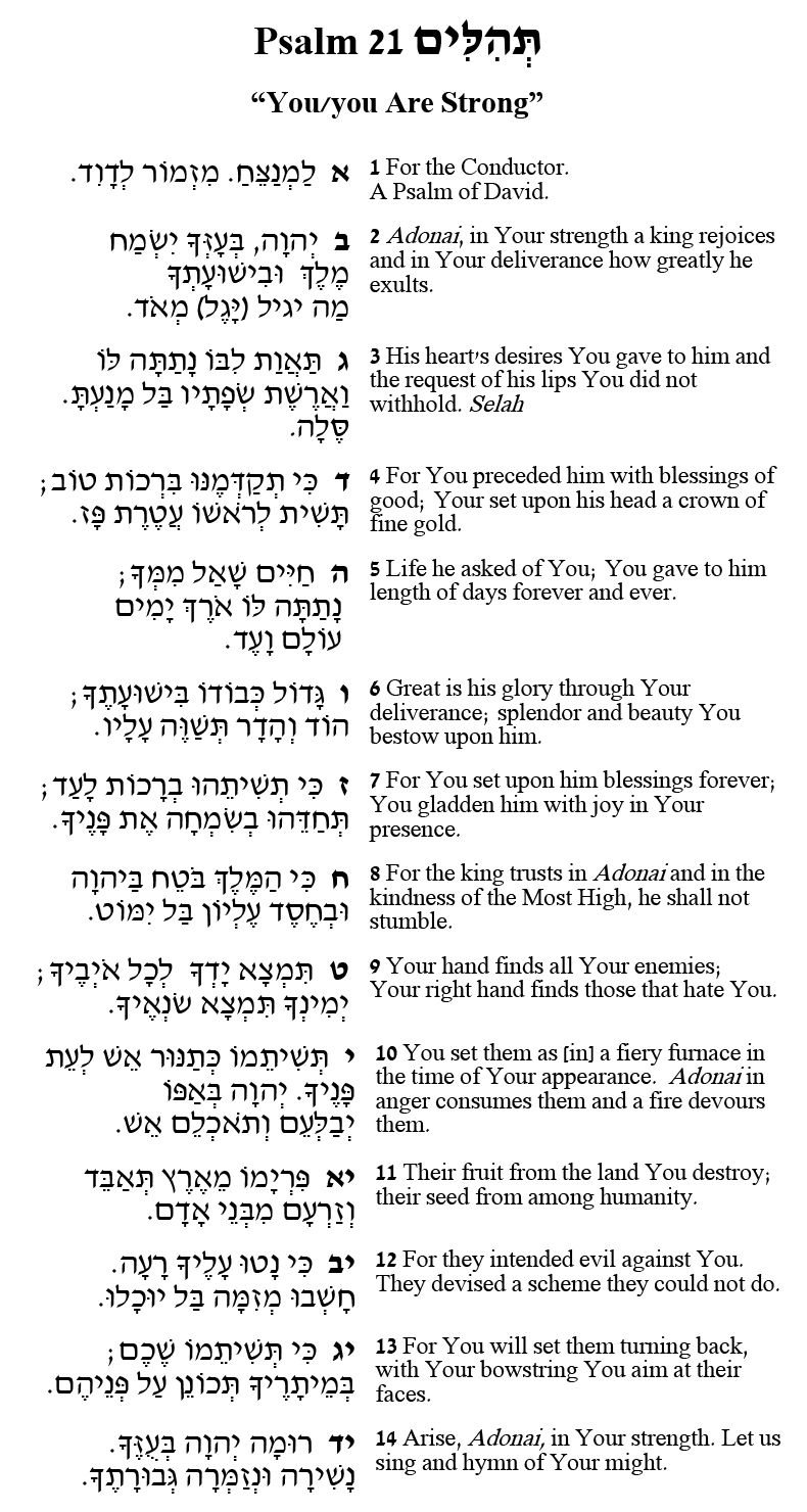 The commentators agree that Psalm 21 begins with praise of God’s care for the trusting, earthly king. Where commentators differ is over the capitalization of the word “you.” For in Hebrew pronouns lack capitalization. Is the focus of the second half’s descriptions of military victories praising the earthly king, or the Divine, or as a subtle description of the partnership of the two? Come and study this artfully woven Psalm and its description of the fulfillment of desires even before expressed and the crushing of enemies.