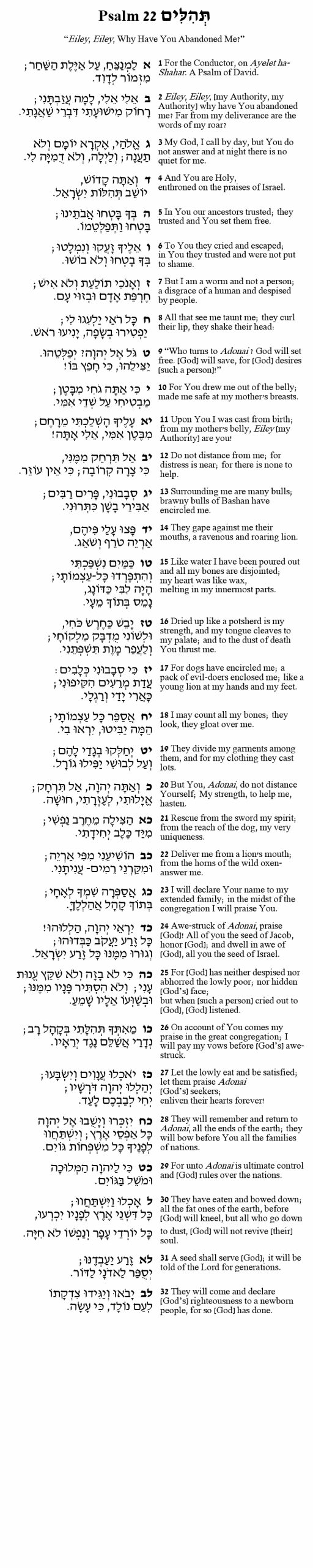 “My God, my God, why have You forsaken me?” With those words our Psalmist expresses despair over the taunts by others and also self references as “but a worm.” The palette of emotions across Psalms is colorful and varied. Historically, Psalm 22 was used as a statement by Jewish communities during times of struggle and the Vilna Gaon directed its use as the Psalm for Purim. This Psalm is also contained in our Rosh Hashanah Amidah prayers. Come to examine the artistry of the composition and to find its relevance for our time.