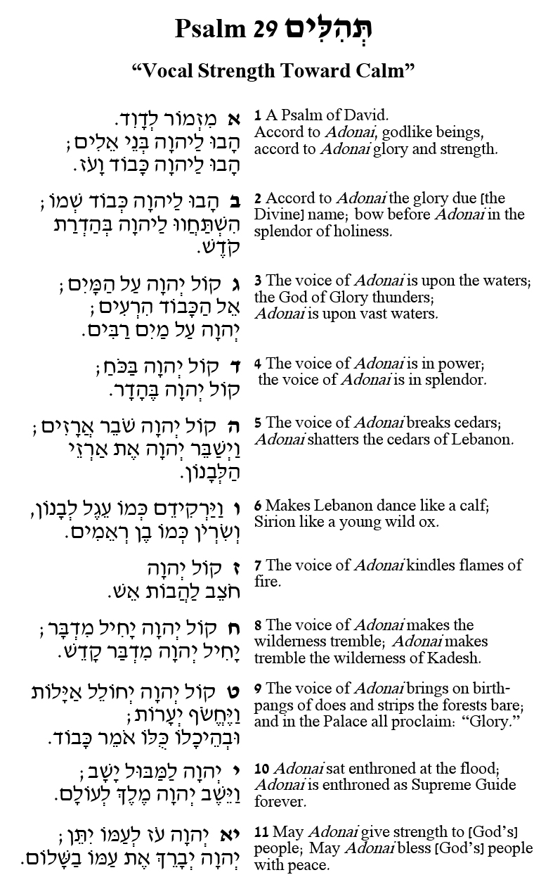 Psalm 29 is familiar to many of us due to its repeated use on Shabbat. We chant it as the sixth Psalm of Kabbalat Shabbat. The imagery of God’s voice thundering over the waters and prompting mountains to dance conveys a celebration of creation. On Saturday morning, we sing this Psalm as we return the Torah to the ark. In this second context, the verses evoke the giving of Torah at Mount Sinai with “Voice of Adonai” repeated seven times. Some scholars attribute the origins of the Psalm to the ancient Near Eastern creation stories, which speak of “descendants of the gods” as a term also used in this Psalm. Yet here, God’s unchallenged power is uniquely conveyed. The Psalm is filled with the sounds of a storm moving across the land, but ends in God sitting on the throne, conveying abiding calm. The last word is shalom, peace, foreshadowing the last word of the Amidah and Kaddish that are just ahead in Shabbat prayer.