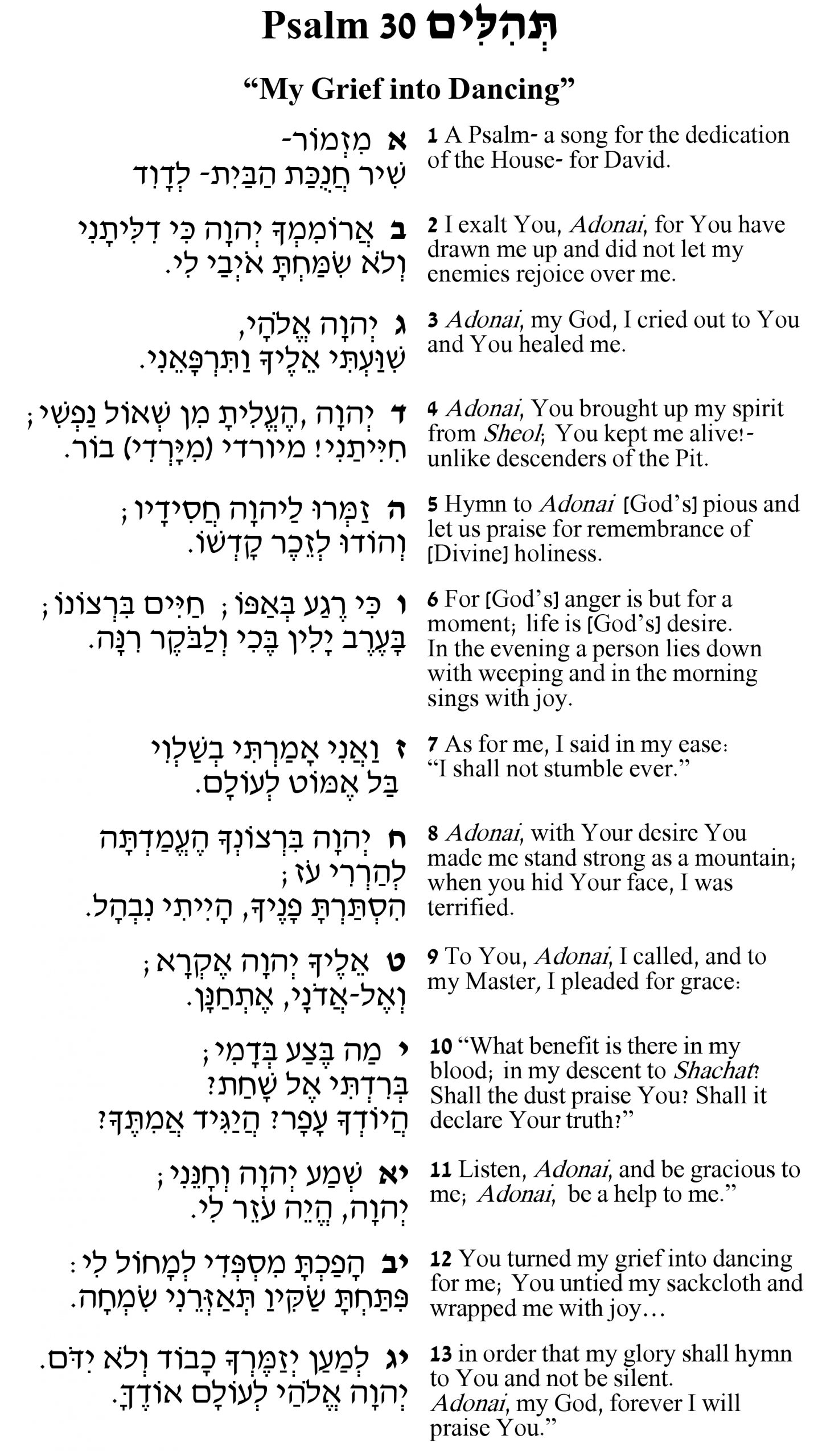 “You reversed self-eulogizing Into a swirling dance.” We are told of healing from an illness that took the Psalter to the edge of death. We are not told the nature of the illness, whether physical or emotional. We are told that the Psalter found a reversal toward fortune by turning to God. Reading this Psalm brought AA meetings to my mind where participants speak of hitting bottom and rising toward stability by turning their lives over to a “Higher Power.” Verse seven, reads, “As for me, I said in my ease, ‘I shall not stumble ever.’” The before and after that middle verse recognizes the need for humility and dependence for enduring strength.