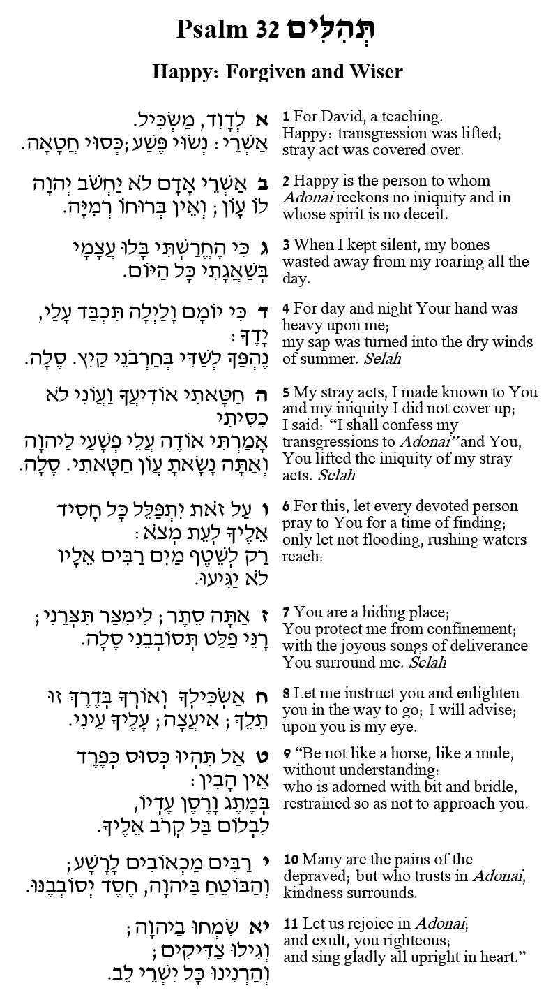 Psalm 32 is a celebration of forgiveness by God. The second half conveys wisdom that emerges from that process. Rabbi Nahman of Bratslav listed this Psalm as one of ten to recite for self-repair. We traditionally chant it on the Eve of Rosh Hashanah.