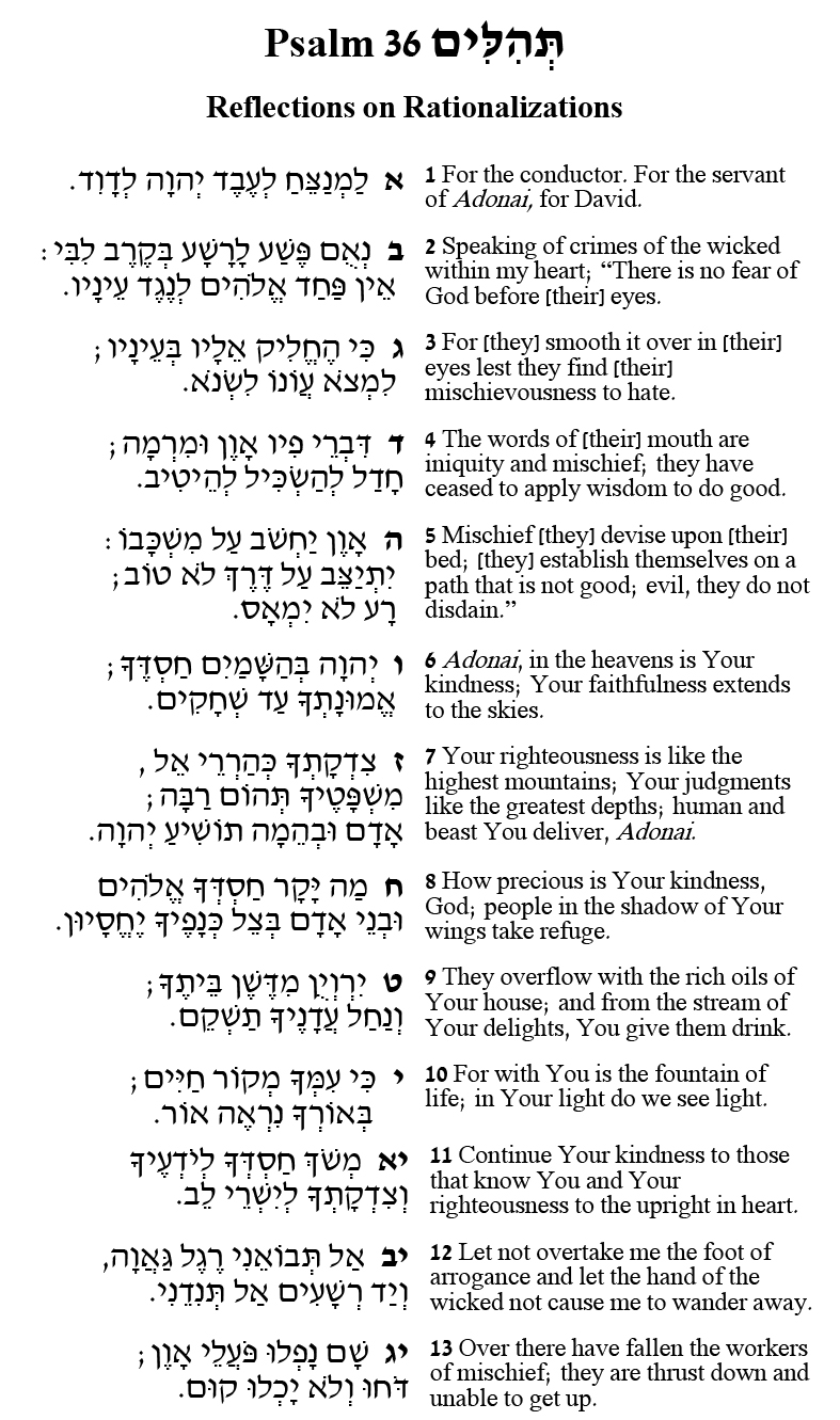 Verses 2 and 3 are subject to many varying translations. The opening word נאם (ne’um) appears well over two hundred times in Hebrew Scripture, but only this one time in Psalms. The word is identified with God’s speech or the channeling of God, as with Bilaam. Some translators view this word as an expression of an oracle or as Transgression speaking about the nature of the heart of the sinner. I have chosen to follow those translators to just translate the word as “speaking,” as the Psalmist reflects in his heart on the nature of those who have “no fear of God before their eyes.” The Psalmist identifies the power of rationalization of bad behavior as the source of blindness to God’s goodness and presence in the world. The Psalter in verse 12 asks God for help in those evildoers not overtaking him, and thereby leading to a seduction of bad behavior. Rabbi Benjamin Segal surmises that the Psalmist might know the way of the sinner from the inside, therefore as a recovery Psalm seeking not to relapse. I tend to see the Psalm as emerging from dealing with selfish people who rationalize bad behavior and the awareness that there is a small piece of that temptation in each of us and asking God to be our source of light so as to stay on the path of goodness. This Psalm is distinctive in its recognition of self-deception as a form of enticing darkness.