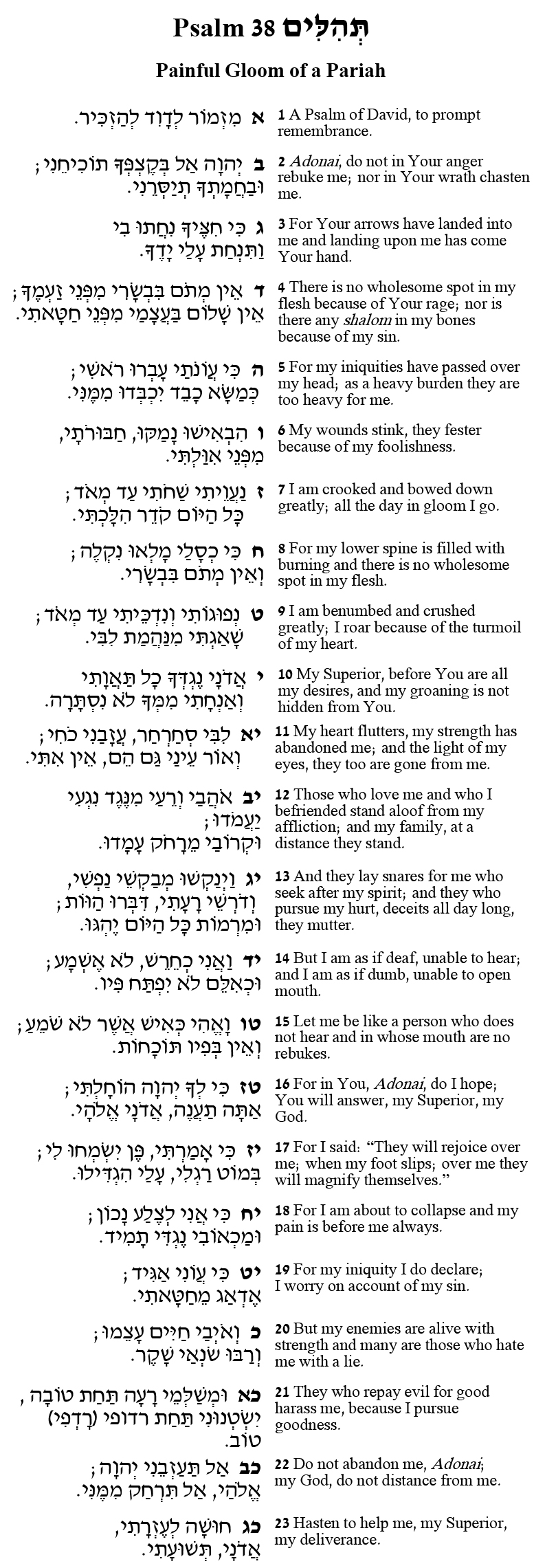 There is a distinction between the blues, which is a natural part of life, and clinical depression, which is dangerous and more rare. Here the Psalter says, “I am benumbed and crushed greatly, I roar because of the turmoil of my heart.” That roar is understood as an internal cry, for we also read, “I am as if dumb, unable to open my mouth.” The anguish is also due to extreme physical ailments, “My wounds stink; they fester because of my foolishness.” This Psalm raises religious questions: “What is God’s role in our physical suffering? and, How much are physical maladies self-inflicted and psycho-spiritual at their root? This Psalm sensitizes us to the inner suffering of others and challenges us to consider how do we find relief from feelings of isolation and physical pain.