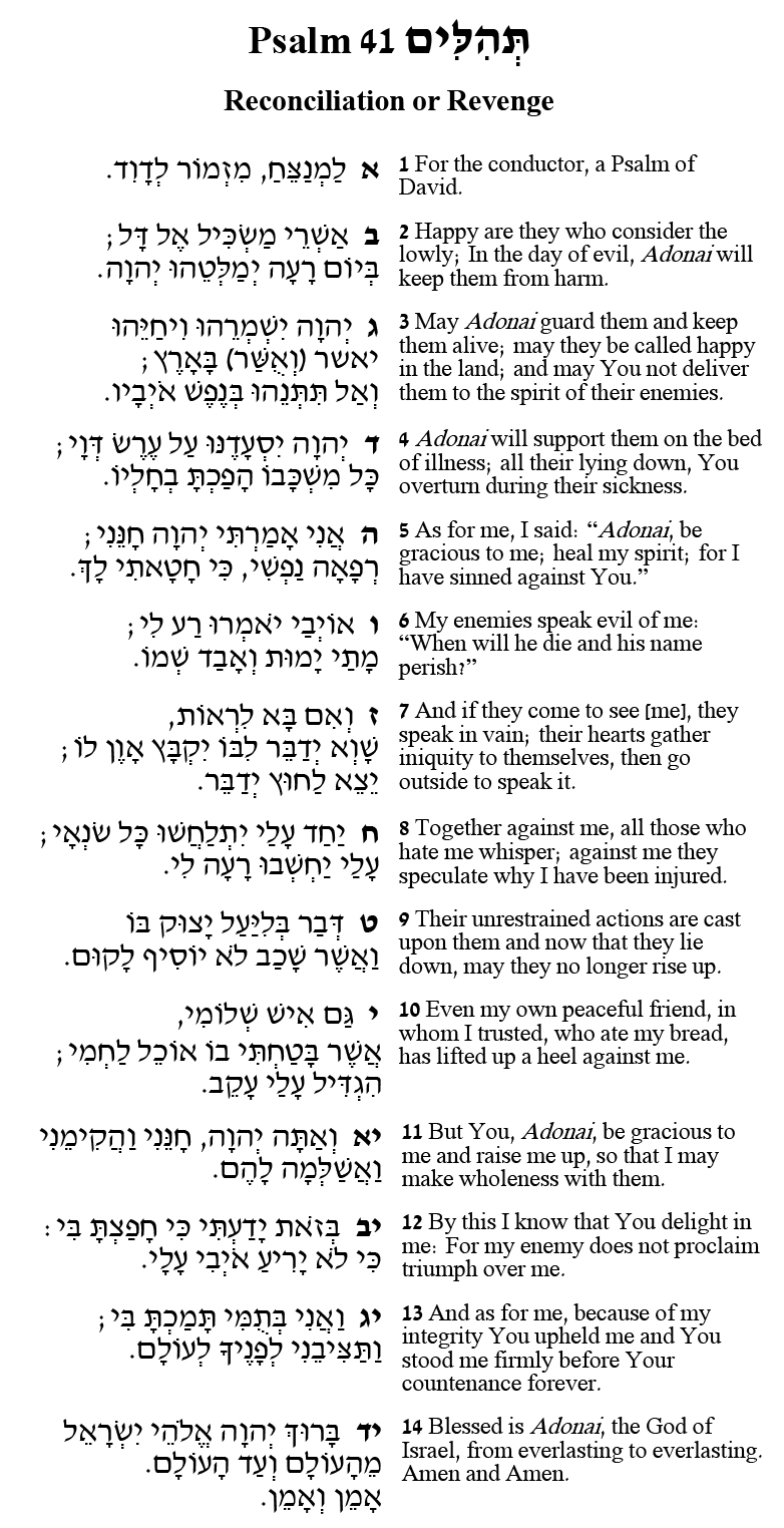 Psalm 41 repeats a theme: the pain caused by deceitful enemies. But the ultimate plea to God in regard to those who “hate me with whispers” is subject to two opposite understandings, namely revenge or reconciliation. Both possibilities are contained in verse 11 and the Hebrew word “Ve’ashalmah.” In the whole of Hebrew Scripture, this is the only time that this exact word is used. And yet, its root is shalom, familiarly meaning “wholeness.” Whether the wholeness sought is “payback” or “peace” is unclear and both are found in the commentaries.