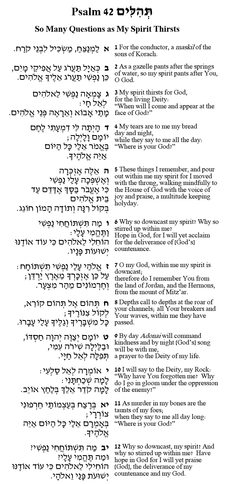 Psalm 42 marks the beginning of the second book of Psalms. In the first book, King David is consistently presented as the source or the subject of the Psalm. Psalm 42 begins with “a hymn of the sons of Korach.” You may recall Korach from the Book of Numbers as Moses’ cousin who led a revolt over leadership and who with his followers was swallowed up by the earth. Remarkably, Korach’s descendants are mentioned in the book of Chronicles as leaders of the Levitical choir. Classic Jewish commentators will debate if the sons of Korach composed or only sang these words.