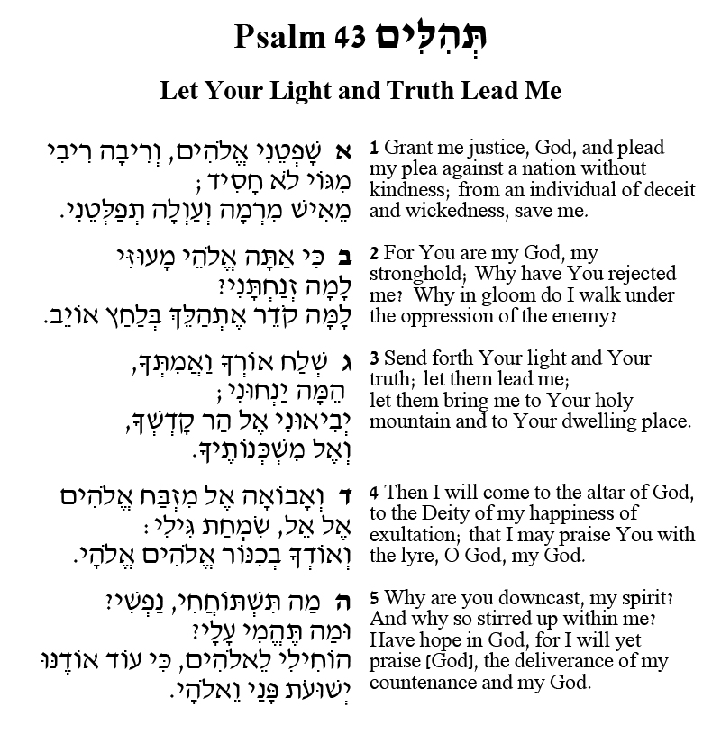 Most contemporary scholars put Psalm 42 and 43 together. For Psalm 43 lacks the attribution of the Psalm’s authorship, is closely linked in theme, and concludes with a verse from the previous Psalm.