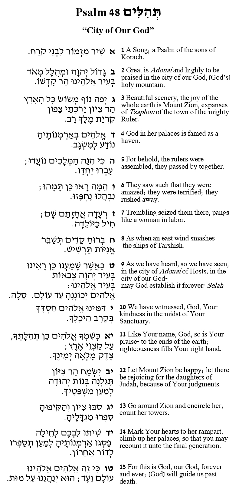Psalm 48 focuses on Jerusalem. This Psalm beckons a pilgrim to examine the durability and magnificence of the holy city as the City of God.
