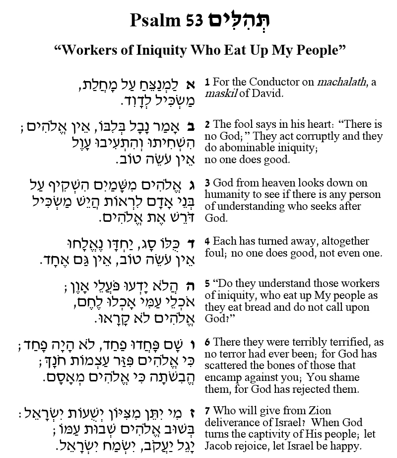 Psalm 53 looks like a repeat of Psalm 14. They are almost identical except for some key word changes. And yet, Rashi, the 11th century commentator, ascribes Psalm 14 as the aftermath of the destruction of the First Temple (586 BCE) and Psalm 53 as following the destruction of the Second Temple (70 CE); Malbim, a 19th century commentator puts Psalm 53 with the withdrawal of the Assyrian troops in 701 BCE. A side benefit of the study of Psalms is exploring Jewish history.