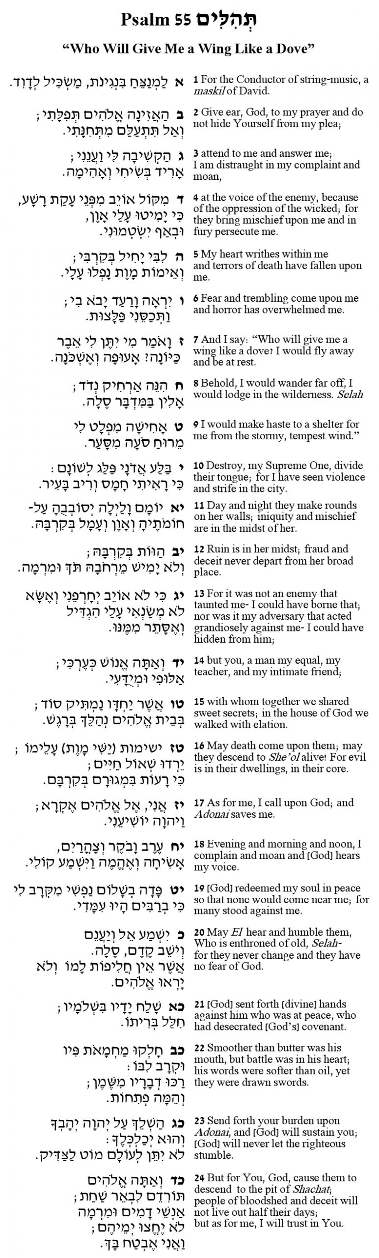 Noah sent forth a dove from the ark to determine if the life-threatening floodwaters had subsided (Genesis 8: 9-12) The dove returned with an olive branch in its beak, which would become an enduring symbol of peace. Here the endangered Psalmist daydreams, “Had I wings like a dove.” In this case, the source of terror is an intimate friend. Such a betrayal shakes the Psalmist to his core. The Psalm has a dreamlike, non-linear quality in its descriptions of longed for escape from and punishment of the enemy. The image of the dove, Rabbi Richard Levy states, is figurative for all of us: May we be blessed with wings to gain perspective on our gains and pains, a perspective that enables shelter in the storm.