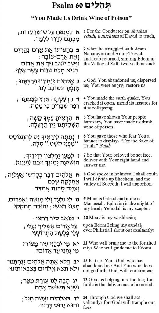 Some lines take your breath away, such as Psalm’s 60:5 addressed to God: “You made us drink a wine of poison.” The claim that God would spike a drink of rejoicing is quite jarring. The context suggests a recently lost battle with continued fighting on multiple fronts. The Psalmist yearns for God’s reconciliation in order to triumph. As if channeling a prophecy, the Psalmist hears God’s voice promising both victory and the unifying of the twelve tribes. There is ambiguity whether the oracle promises God’s or David’s successful fight, suggesting that the two are intertwined. Psalm 60’s references to Philistia and the northern tribes evidence an early composition, a composition that could well have been composed by King David. Rashi of France of the 11th century interprets the Psalm as an ode to the Sanhedrin, the High Court of seventy symbolically representing the seventy nations of the world, who had given him permission to go to battle to enable a universal peace.
