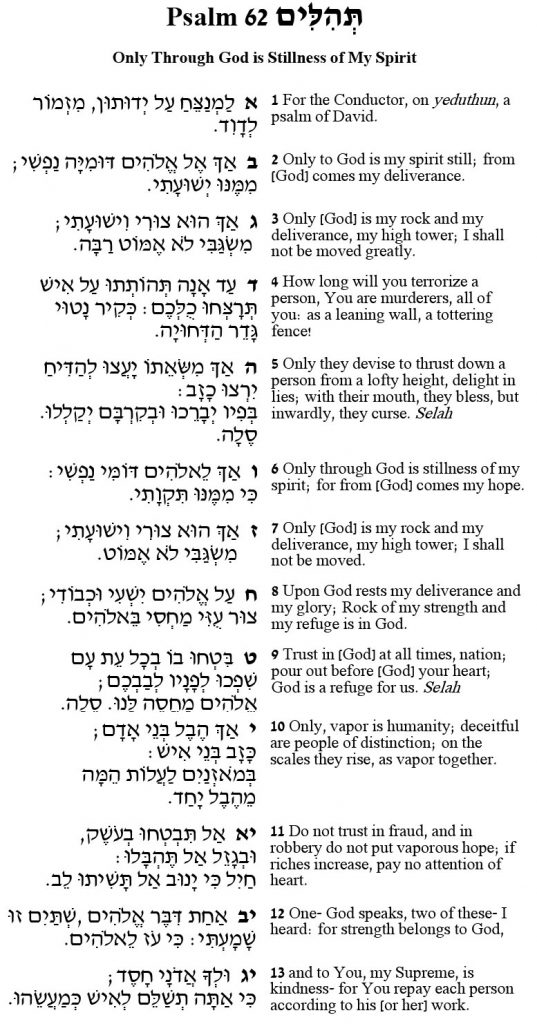 The study of Psalms offers the possibility of more than one understanding of any word or phrase. This is true for all of Torah. This idea is conveyed in a phrase of this Psalm (62:12): “One- God speaks, two of these- I heard.” Jeremiah (23:29) will say of God’s word that it is “like an anvil smashing a rock,” an image of many sparks emerging with each blow: many possible interpretations of each word. The Talmud (Sanhedrin 34a) will comment that each verse of sacred text can be broken down into many lessons and interpretations.