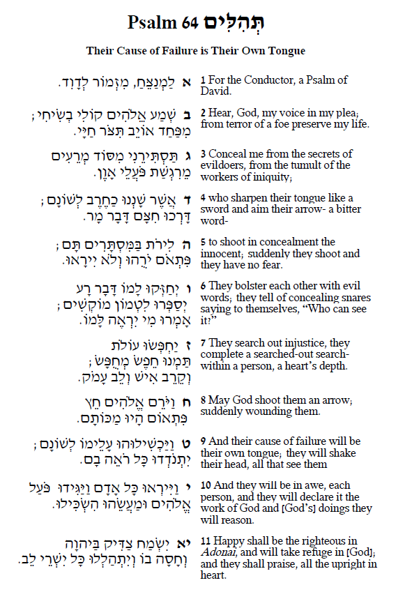What motivates a hurtful liar? The Psalmist describes a fearlessness that comes from the belief that no one will know better- “Who can see it?” (verse 6): whether the intended victim or God. Lying words are described as arrows: can damage from a distance, once released have their own power, and can even kill. And yet, as a religious person, the Psalmist has a prayer and a faith that the villain’s own tongue will be the source of failure (verse 9) and that the defeat will be widely recognized as the way of justice, the doing of God.