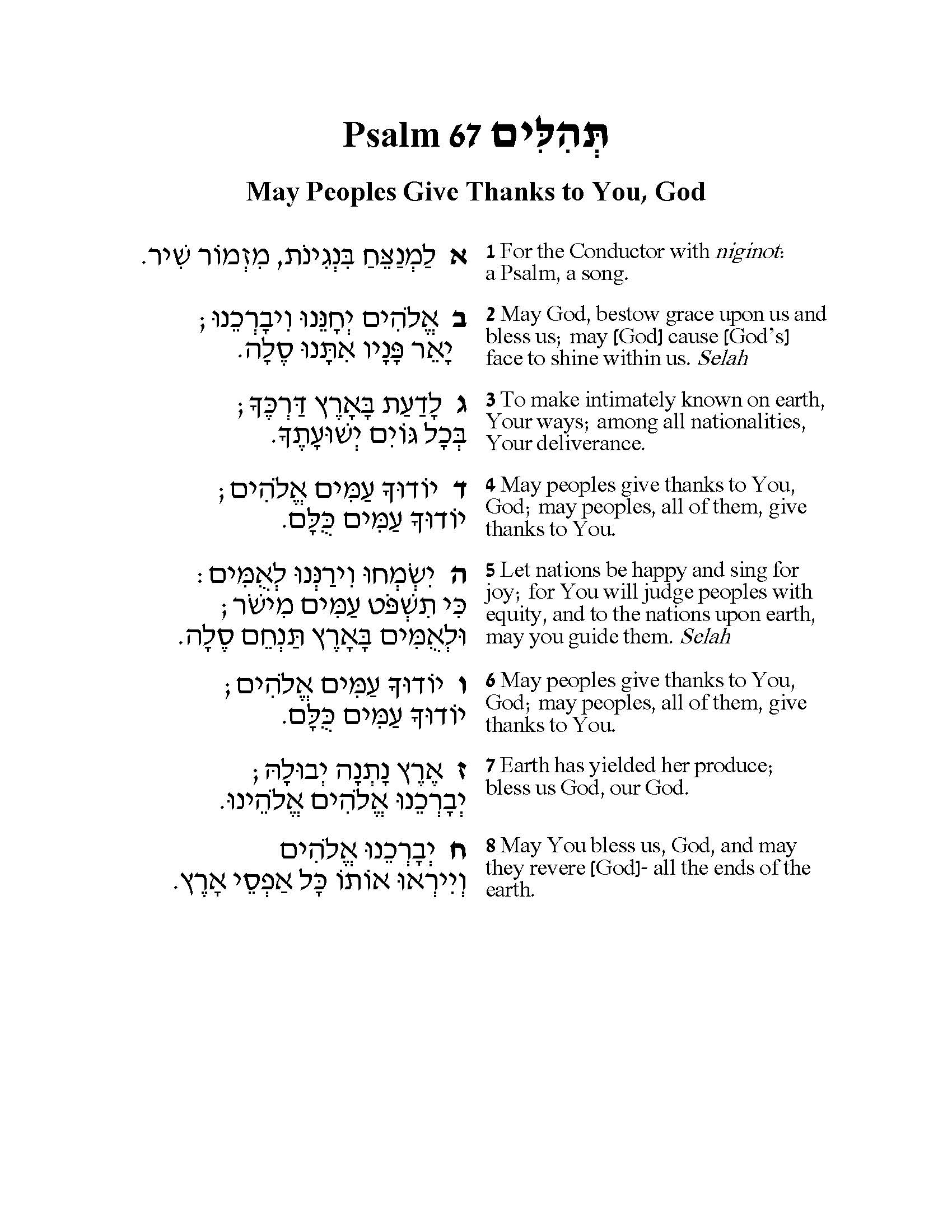 Thanksgiving warrants a song, which Psalm 67 delivers: “May peoples give thanks to You, God.” This short Psalm identifies the God of the Israelites as the God who seeks a relationship with all peoples; with a vision of a future of shared rejoicing amidst God’s bounty.