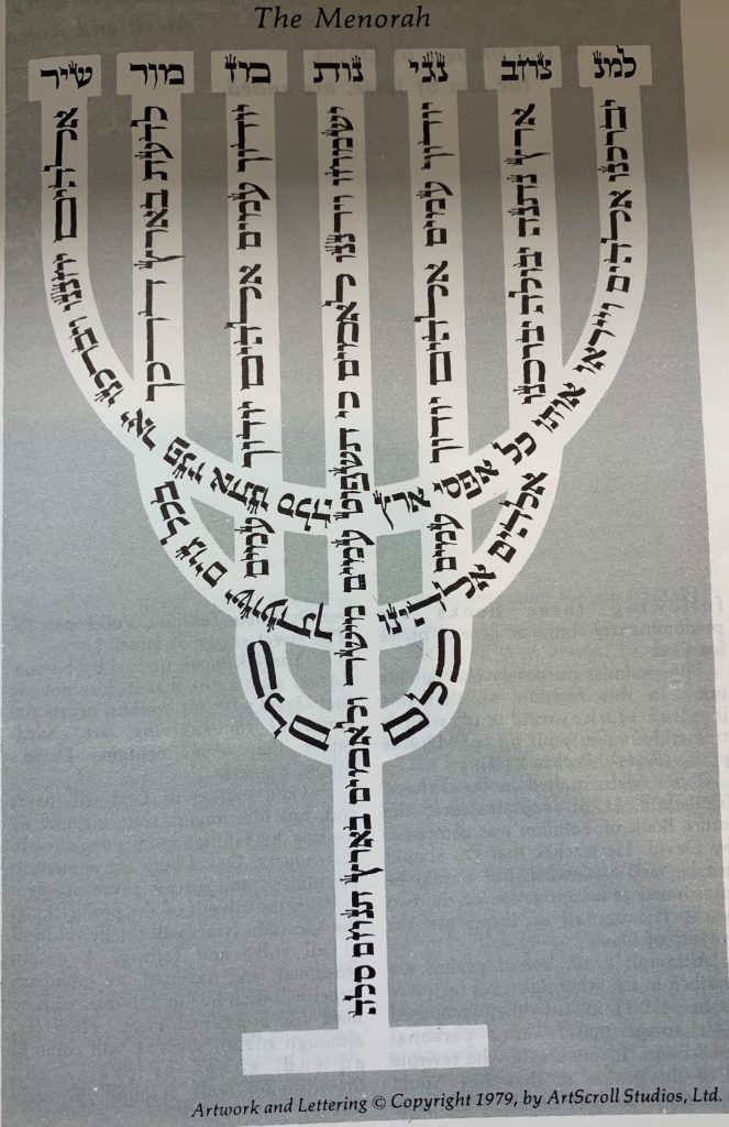 This Psalm is also called “The Menorah Psalm.” Composed of 7 symmetrical verses and totalling 49 words, the Psalm was traditionally recited during the forty-nine days between Pesech and Shavuot as an inward journey toward greater refinement. The image of the words in the shape of the seven-branched menorah of the Holy Temple was used by the mystics as a focal image for prayer, believed to illuminate divinely the person from within.