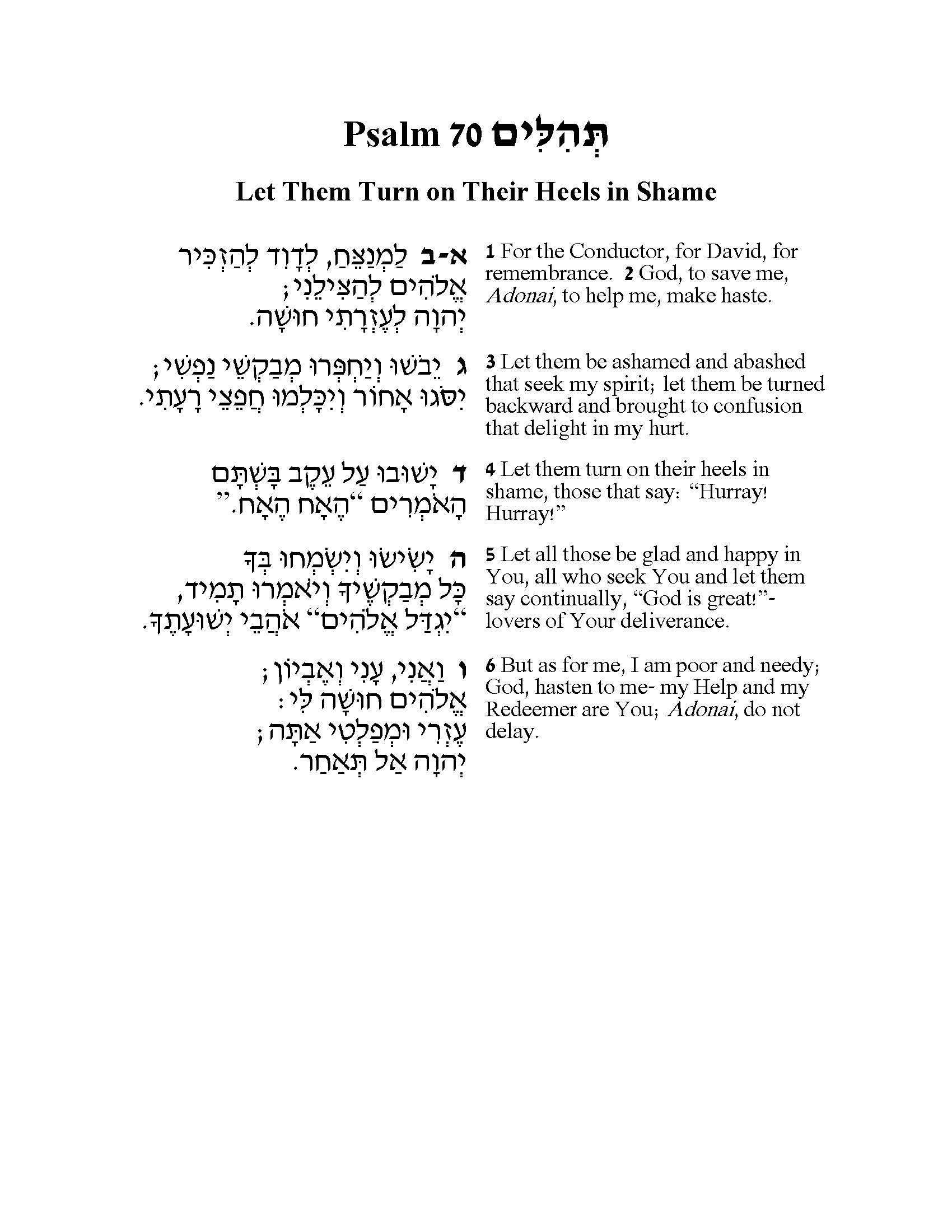 The brevity of Psalm 70 conveys “urgency”- the key word in both the opening verse and as the final word. The five verses are also contained in the far longer Psalm 40. Robert Alter speculates that this short Psalm came first, pointing to the phrase “Let them turn on their heels in shame” (Psalm 70:4) as making more sense than “let them be devastated” (40:16), which the modern scholar attributes to a scribal change.