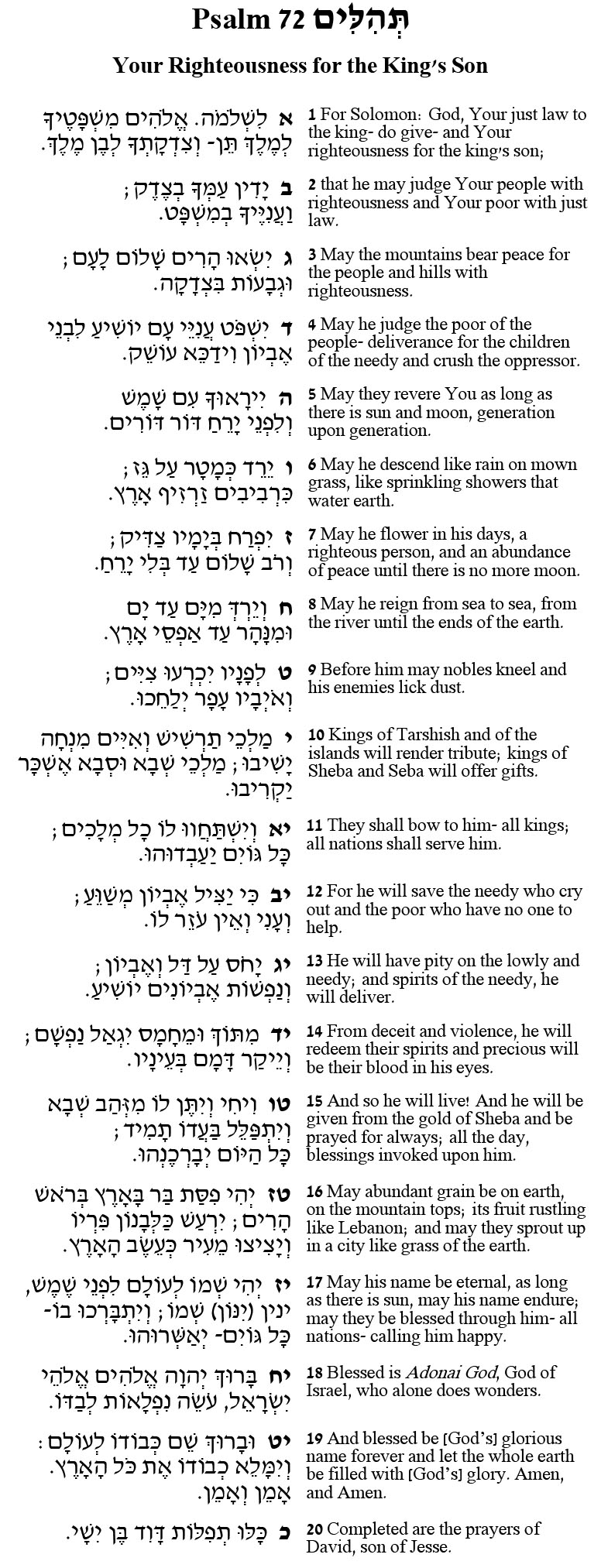 What defines a King as worthy? Psalm 72 is presented as a prayer by King David on behalf of his son, Solomon. And yet, this Psalm’s focus is on the duties of a model King. As stated by commentator Craig Broyles, the message of this Psalm is that “power is achieved not by grasping for the most, but by caring for the least.”
