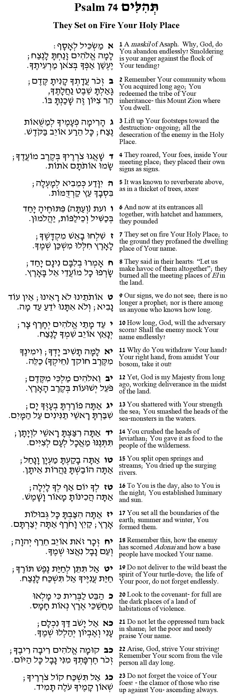 “They set on fire Your Holy Place!” the Psalmist wails. Psalm 74 laments enemies who have left Jerusalem in ruins. The language is similar to Lamentations 2:2-9, which we chant with mournful melody on Tisha B’Av. Jews across history used this Psalm to fervently express their longing for national return.