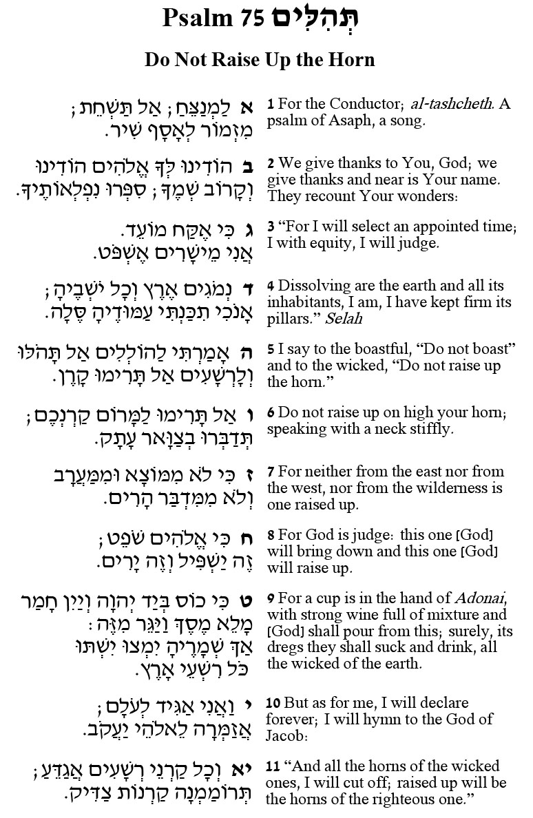 God’s message is for the arrogant to be aware of God’s judgment. The classic Jewish commentators identify the ram-like horn with pride and potential aggression. Those same sages (Radak and Sforno) identify the problem as a hubris that for some accompanies wealth and status. In reading a Psalm, there is an artful dimension. To emphasize the theme, for instance, the word “raise” appears six times and “horn” four times. As a modern reader of such an ancient spiritual poem, we are invited to explore the poem’s artful weave and to ask how the thoughts are relevant for our lives.