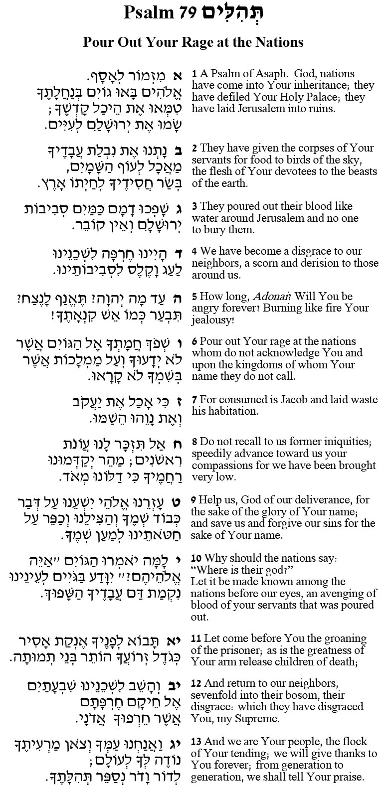 At our Pesech seders, after we open the door for Elijah, we proclaim: “Pour out Your rage at the nations whom do not acknowledge You.” Historically, it was a dramatic moment of courage. For Jews often lived among neighbors who were prone to inflict harm on them. It was as if after Elijah was invited in, we could act as if Messianic judgment and harmony had already arrived. This dramatic proclamation of “pour out Your rage” is the sixth verse of Psalm 79.