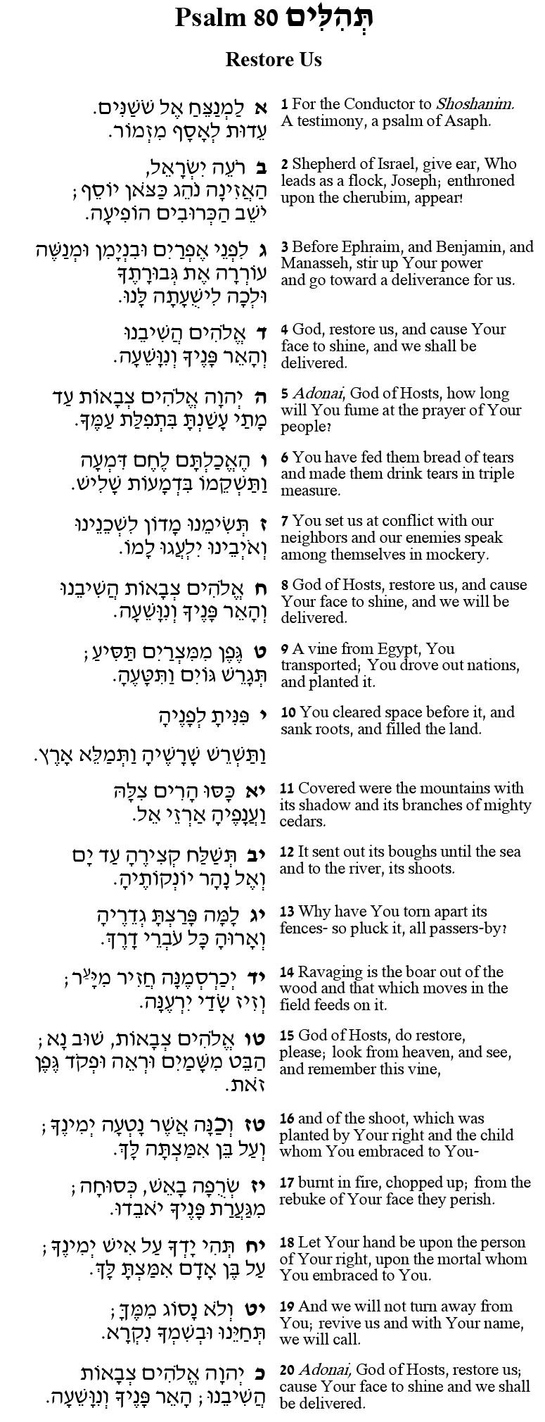This Psalm begins with a focus on the Northern tribes, suggestive of a composition of over 2,700 years ago. Israel is compared to a vine with God as Vintner, who has transported the vine from Egypt and successfully planted it in the Land of Israel, only to allow wild intruders to pluck the grapes at will. The Psalm has a refrain repeated several times, “restore us, cause Your face to shine, and we shall be delivered.” Each time a different name for God is used. Why? Is it due to increasing confidence or despair?