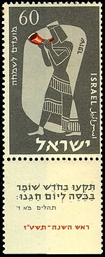 Joyous Festivals 5716 stamp – 60 mil – Ram’s horn with the inscription on tab: “Blow the trumpet in the new moon, in the time appointed, on our solemn feast day” Psalm 81:4.