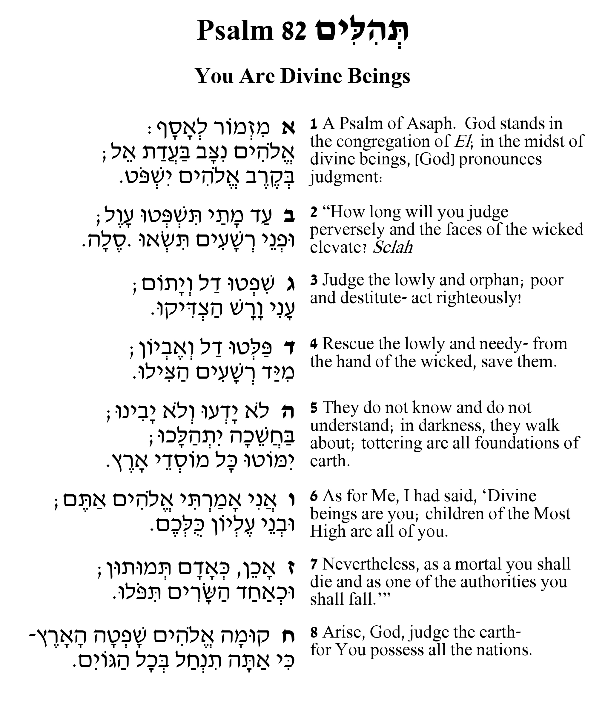 Most of the classic commentators see Psalm 82 as squarely addressing human judges. “Those who use their power unjustly,” this Psalmist says, “totter the very foundations of the world.” Rabbi Shimon ben Gamliel (second century of Israel) will teach, “On three things the world rests: on justice, on truth, and on peace” (Pirkei Avot 1:18).