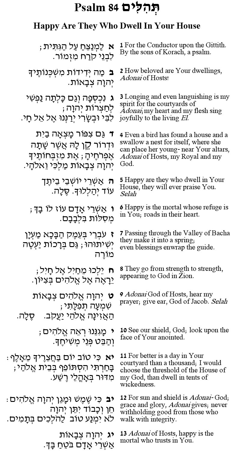 Psalm 84 describes a pilgrim’s journey to the Sacred Temple in Jerusalem, mixing emotions of longing, challenge, and celebration. There is no mention of the rituals of sacrifice, rather the goal is to see and be seen by the Divine. The journey is described as arduous and the reward enduring. Jewish readers during the Middle Ages read this Psalm as words of hope for a Messianic return and rebuilding of the Temple.