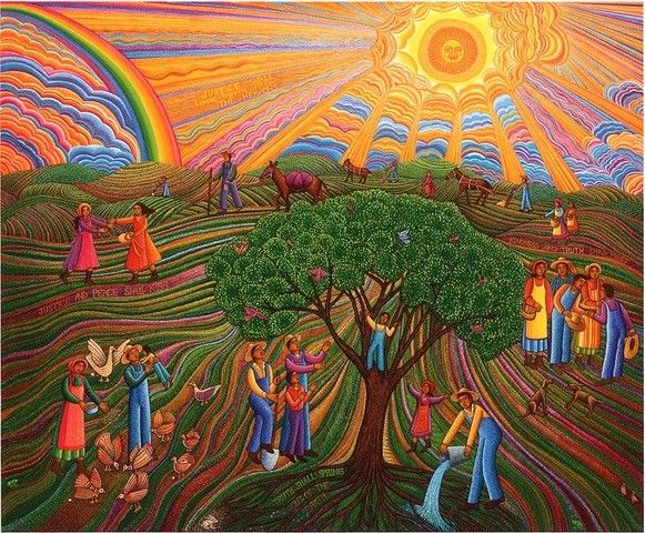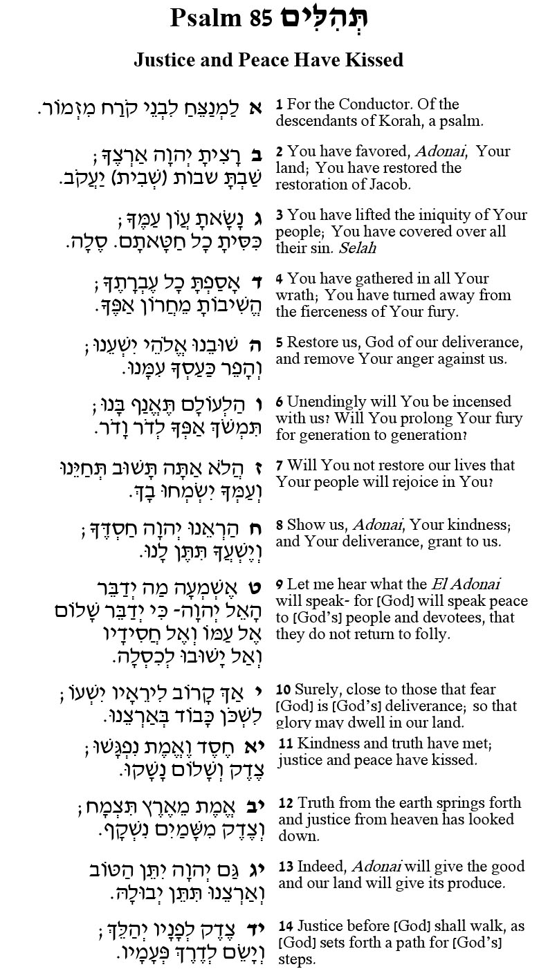 The very middle words of the Psalm provide the break from the cycle of salvation and trouble: “Let me hear what the El Adonai will speak- for God will speak peace to [God’s] people and devotees that they not return to folly” (verse 9). The willingness to actively listen to God will enable the longed-for transformation. And then the vision of a better world where God’s qualities are present on earth as if living beings (see artworks below): “Kindness and truth have met; justice and peace have kissed” (verse 11).