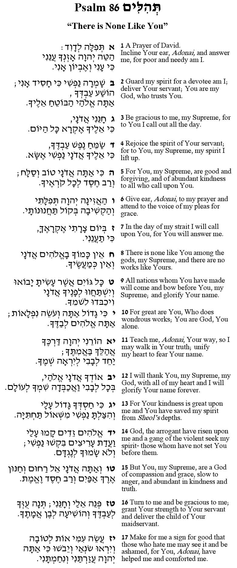 Psalm 86 is a collage of verses from other Psalms and yet the ein kemocha is only found here. Psalm 86 transitions as a “prayer of David” calling on God for aid due to his merit to aid as an expression of God’s grace.