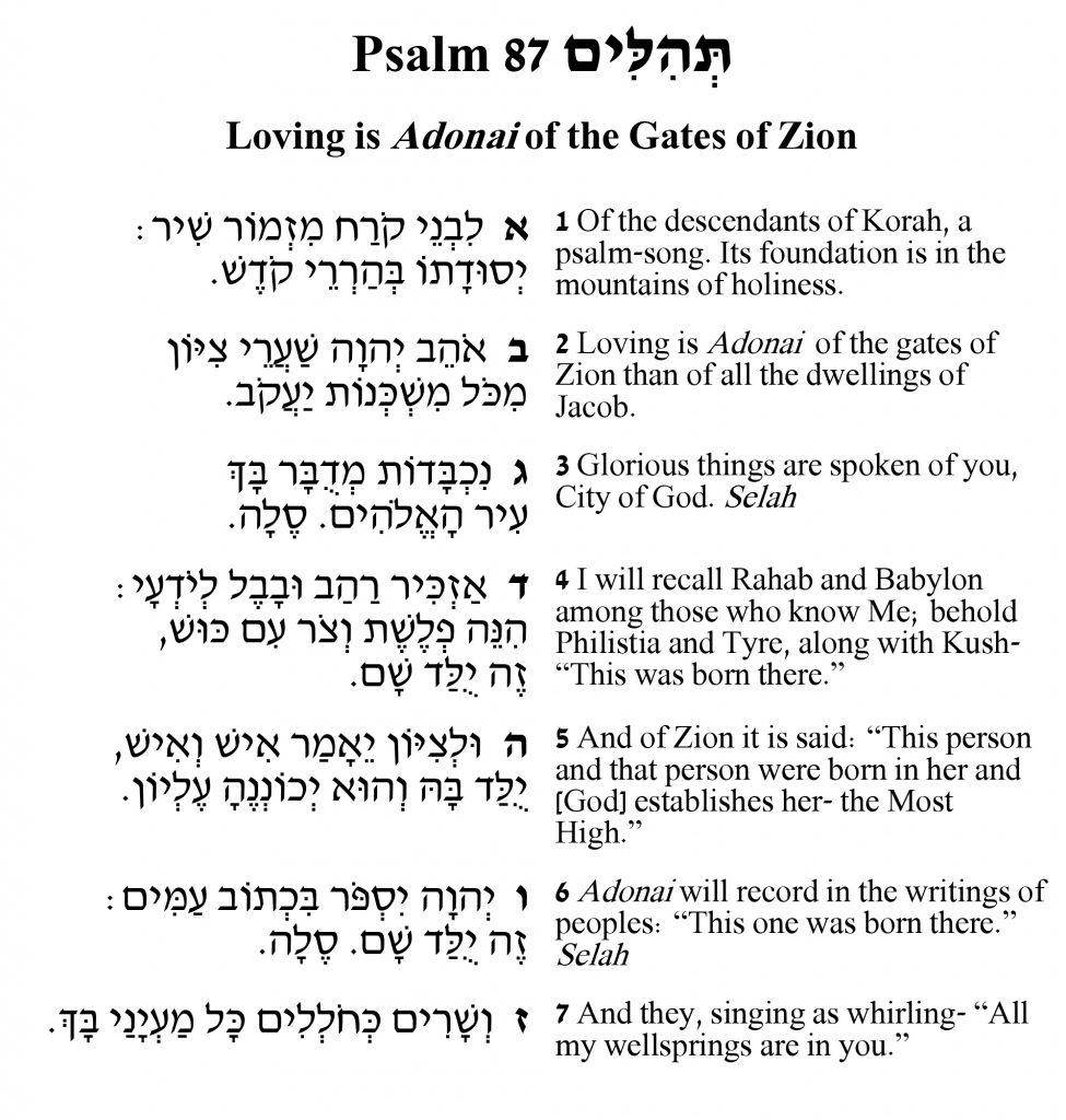 Can you feel as if you belong to Jerusalem even if you were not born there or even live there? Psalm 87 answers, “yes!” This soaring description of Zion puts the site at the center of a pilgrim’s identity and more, at the center of the world. Distinctly, Jerusalem in our tradition is more than a place, it is a beloved for whom we long and from whom we take rejoicing.