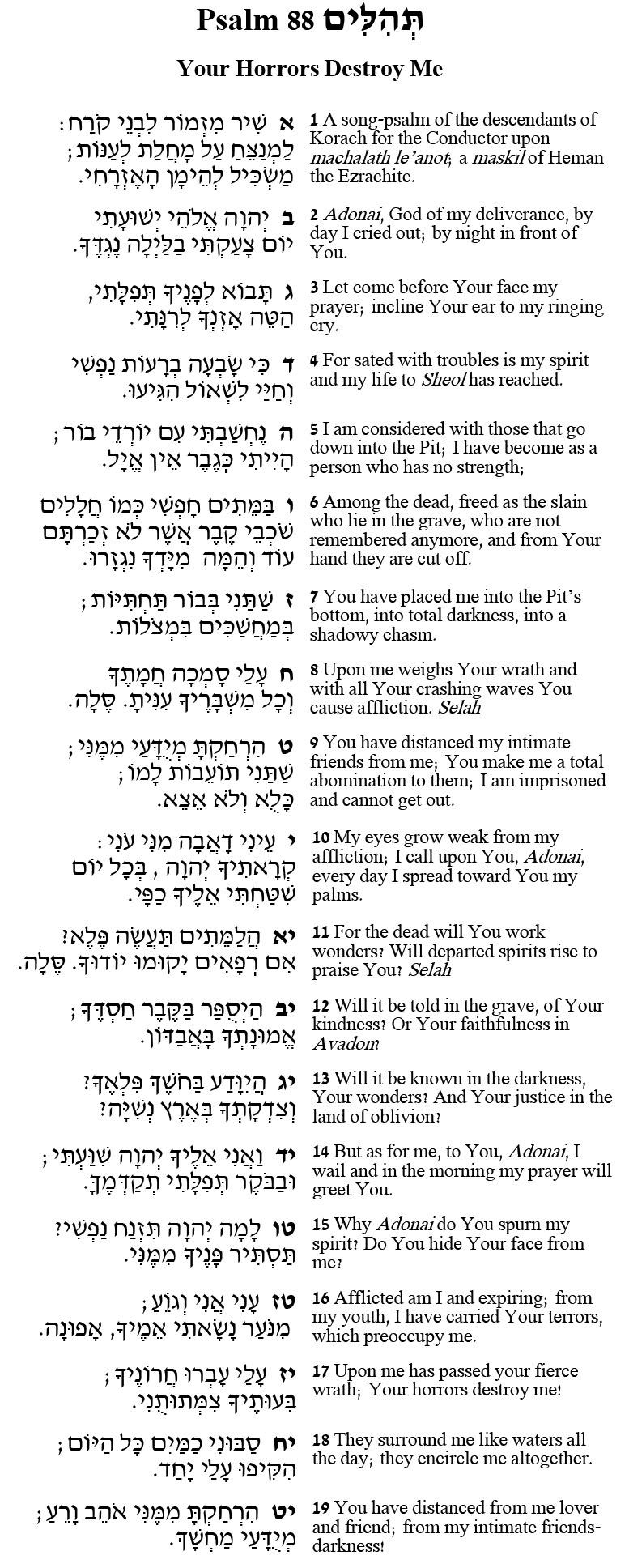 “Your horrors destroy me!” Psalm 88 is unrelentingly painful. The Psalmist feels tortured by God, isolated from friends, and on the brink of death. Expressions of despair are heard in other Psalms, but the last sentence consistently opens a window of hope. Not here. The last word of this Psalm is “darkness!” The paradox of this Psalm is that the honest words are thrust at God, implying an abiding relationship.