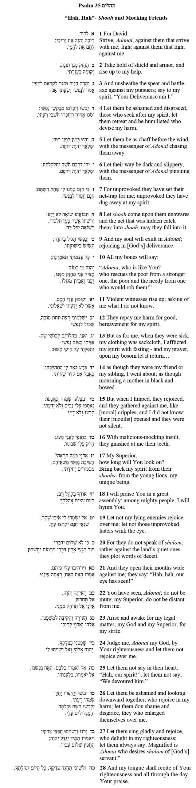 The Psalmist describes the evil of unprovoked enemies who mocked him and sought his destruction. He had acted with great care toward his neighbors, praying for them when they were ill and mourning for them as if family. And those same people, when he limped verbally mocked him and set traps for his destruction.The sinister mocking is described with a rare word that also appears three times in this Psalm: Ha’hach, which I translate as “Hah”.